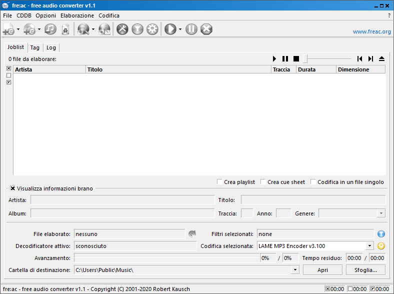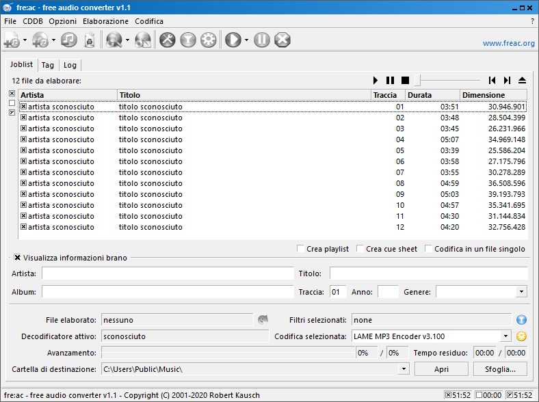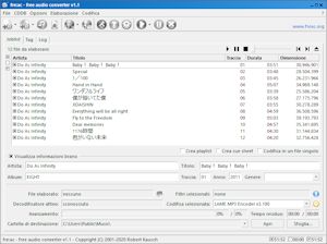 Possiamo anche scegliere di non creare un MP3 per alcuni brani, semplicemente togliendogli il segno × vicino. Inoltre possiamo ascoltare i brani usando i tasti Play, Stop ecc. che si trovano appena sopra alla lista dei brani (non quelli in alto che si colorano al passaggio del mouse!).