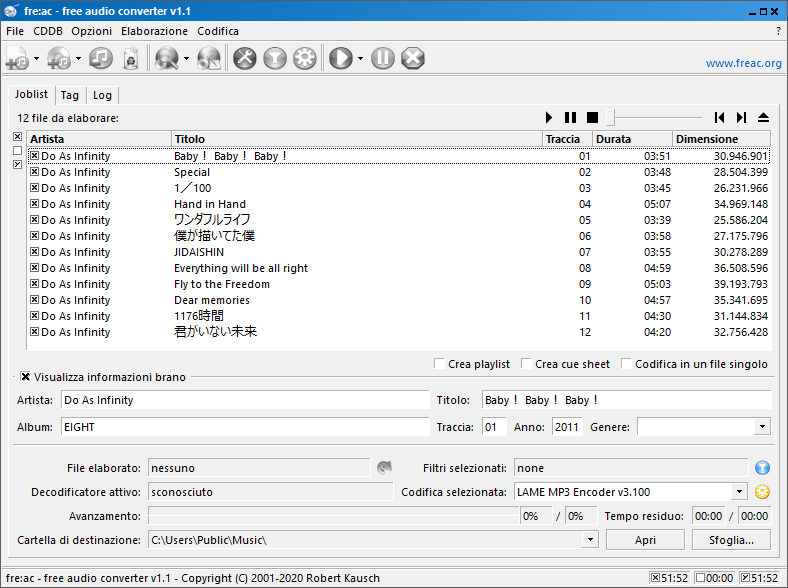 Scegliamo poi in che cartella salvare gli MP3 cliccando sul bottone "Sfoglia..." in basso a destra. Per finire clicchiamo sul nono bottone, "Avvia il processo di codifica", (questa volta è il tasto Play che si colora di verde passandoci sopra) ed attendiamo con pazienza.